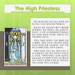 여자 대사제의 장막에 있는 무늬에는 어떤 의미가 있을까요? 여자 대사제 뒤를 가리고 있는 장막을 장식하고 있는 무늬는 종려나무와 석류입니다. 종려나무 잎은 기독교에서 예수가 예루살렘에 입성하는 것을 축하하는 것을 상징하기도 하는데, 그 이전 로마제국에서부터 종려나무 잎은 승리와 성공을 나타내는 상징으로 자주 이용되었다고 합니다. 석류는 수많은 알갱이가 가득 채워진 모양의 열매라 그런지 포도와 마찬가지로 풍요와 다산의 의미를 종종 나타냅니다. 바로 다음 카드인 여제의 옷에도 석류가 등장하죠. 어쩌면 진실을 가리고 있는 장막이 바로 우리 눈앞에 높인 성공 혹은 즉각적인 이익인지도 모르죠. 어쩌면 반대로 그러한 성공이나 풍요로움을 얻기 위해서 우리가 지금 해야 할 것이 무엇인가 생각해 보아야 할 시점이라는 것..